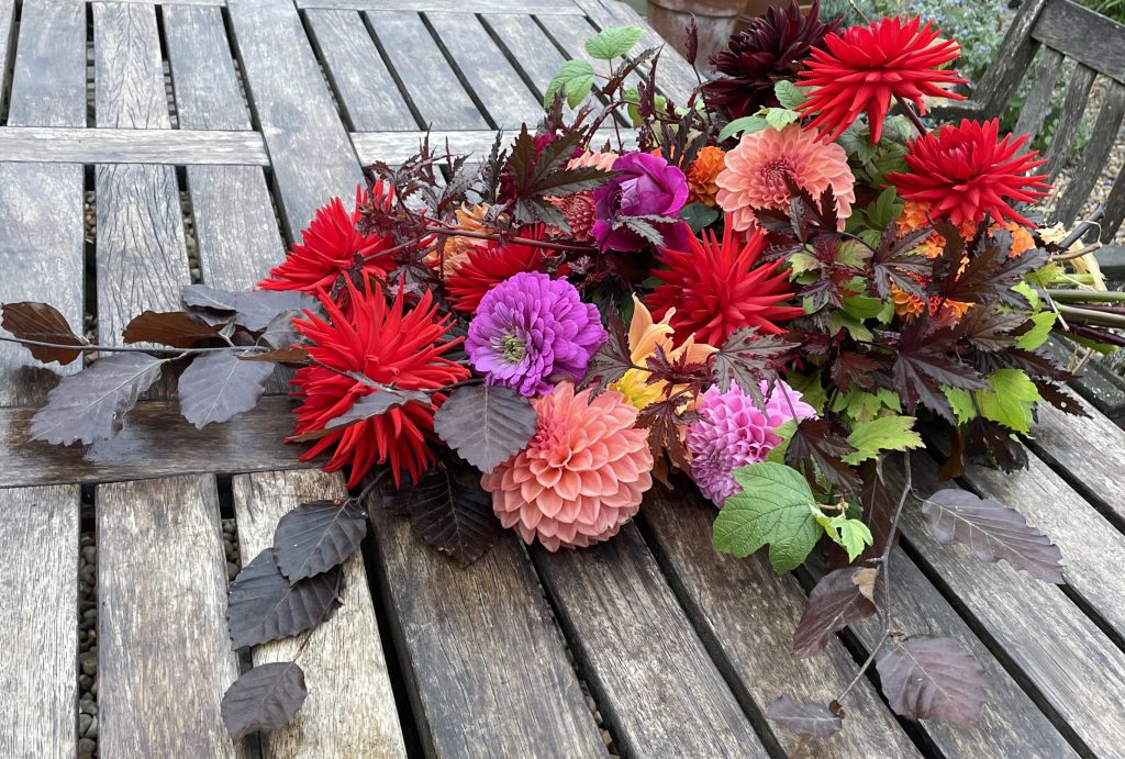 Here a fan of conifer, eucalyptus and artichoke leaves has been used to support late September dahlias, zinnias, adenophora, gypsophila and cosmos.