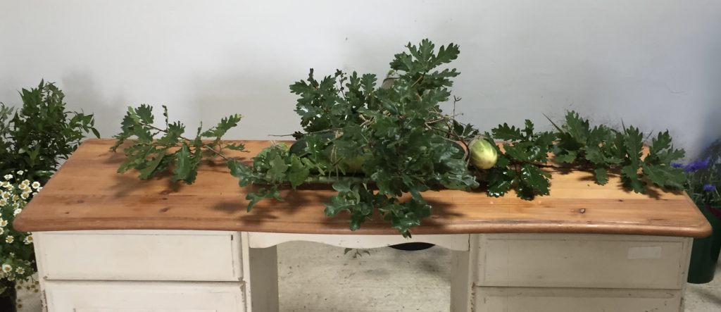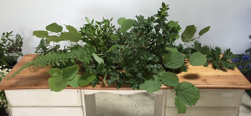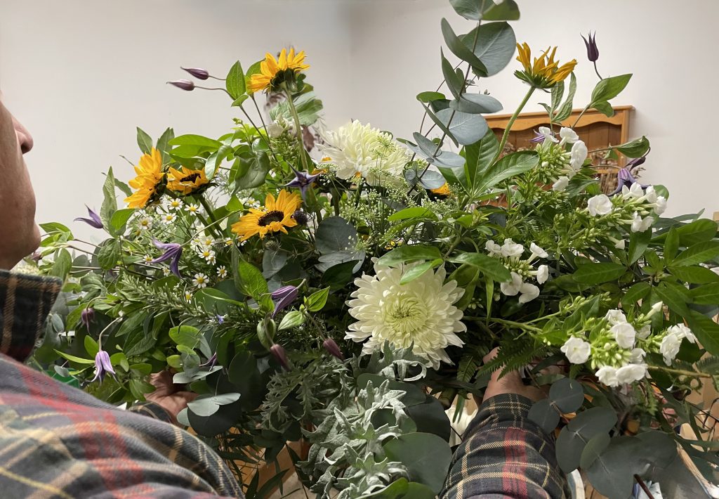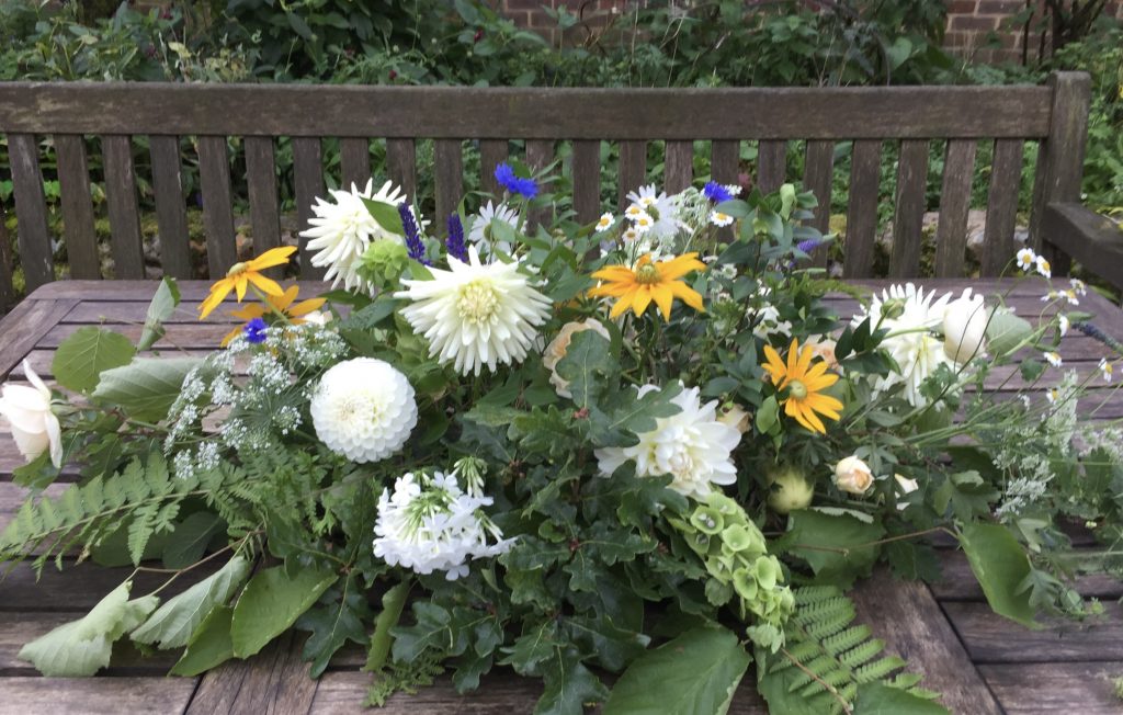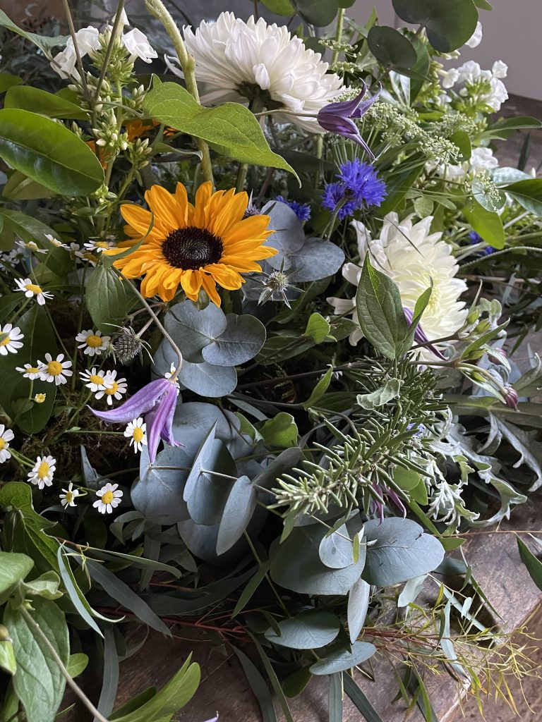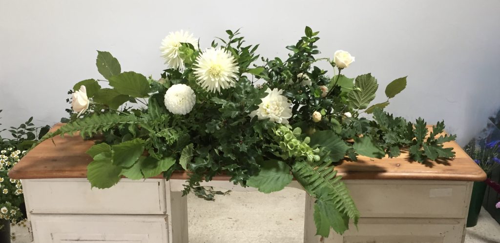 Above is a 4ft (120cm) double ended casket spray which covered the top of his coffin. The gentleman was a local Norfolk boy, a keen gardener right up to the end, with a love of the countryside and connection to nature. Rather than moss and twine I used marrow and cucumbers from his garden as the base, into which we then slotted the flowers and foliage – all grown here at Stone Cottage Plants.